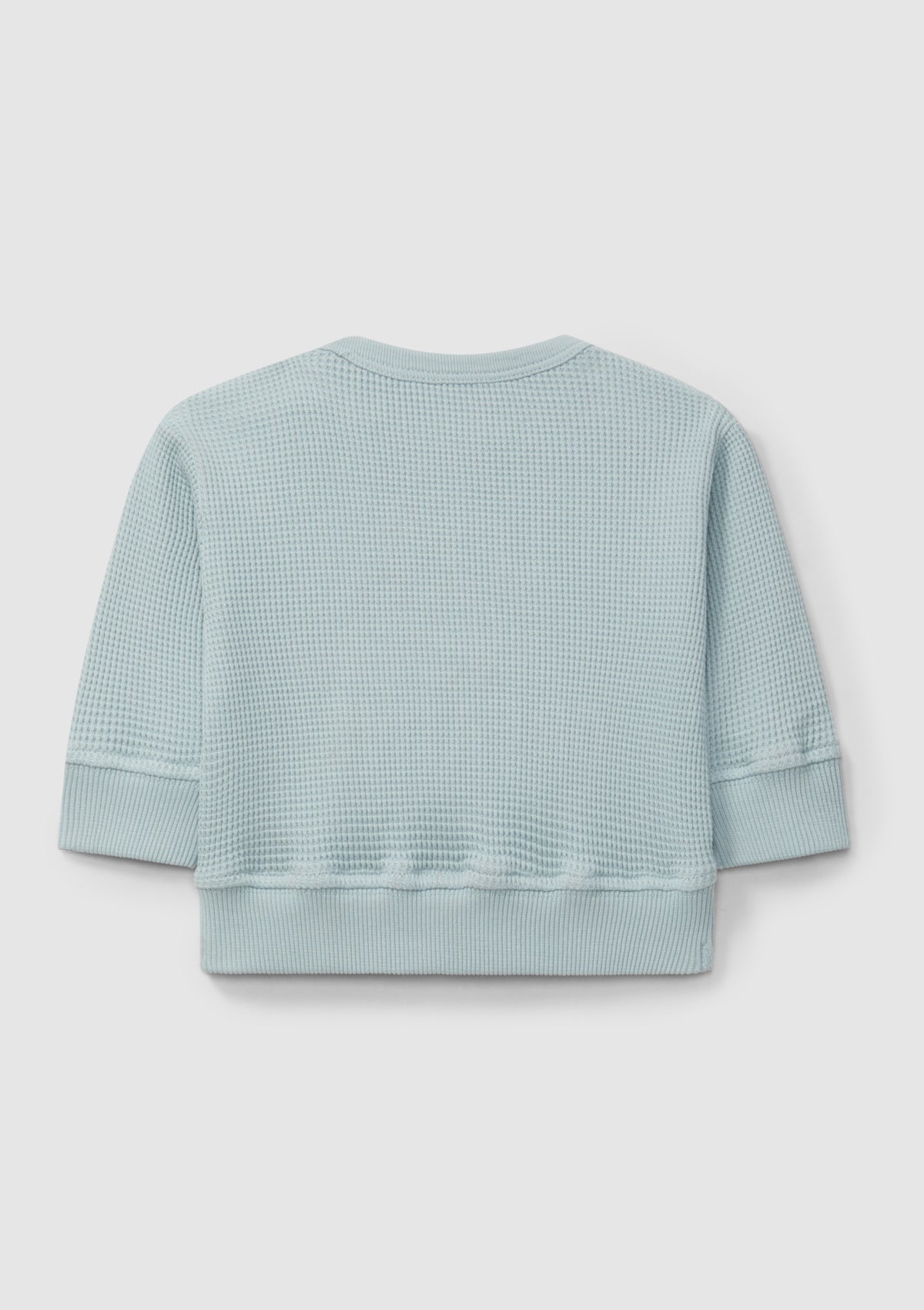 Sweater in 100% organic cotton waffle weave with "Let s be creative" embroidery. Fastens with wooden buttons on the shoulder.